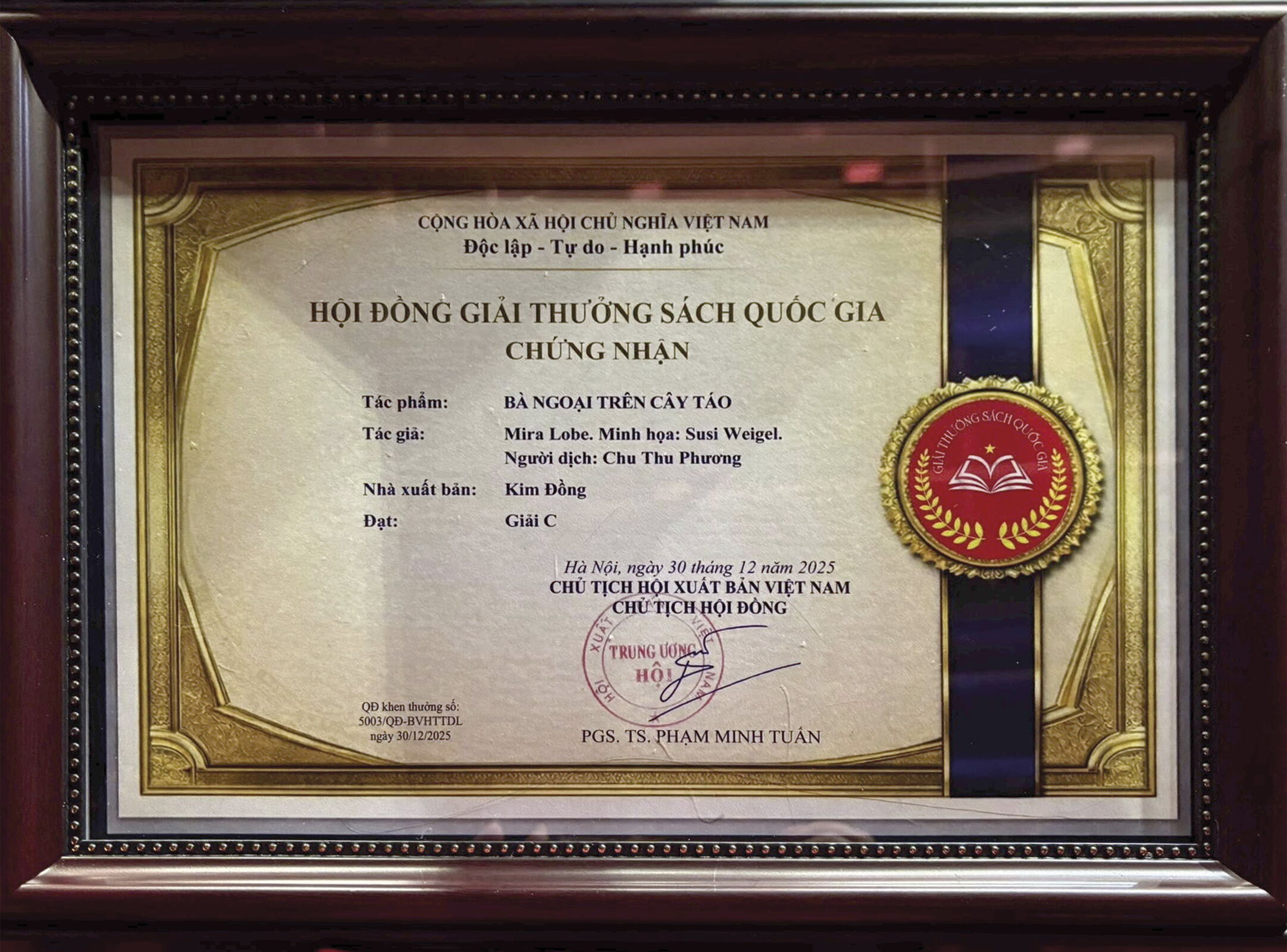 Zum 8. mal wurde Anfang dieses Jahres in Vietnam der National Book Award, also der vietnamesische Staatspreis für die beste Buchpublikation des vorangegangenen Jahres vergeben. Diesmal war es die vietnamesische Ausgabe des Mira Lobe-Klassikers Die Omama im Apfelbaum, die diese Auszeichnung im Rahmen eines feierlichen Staatsaktes erhielt.
